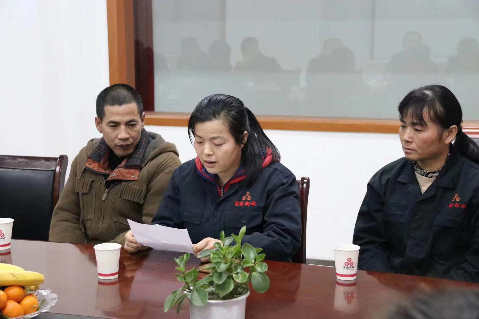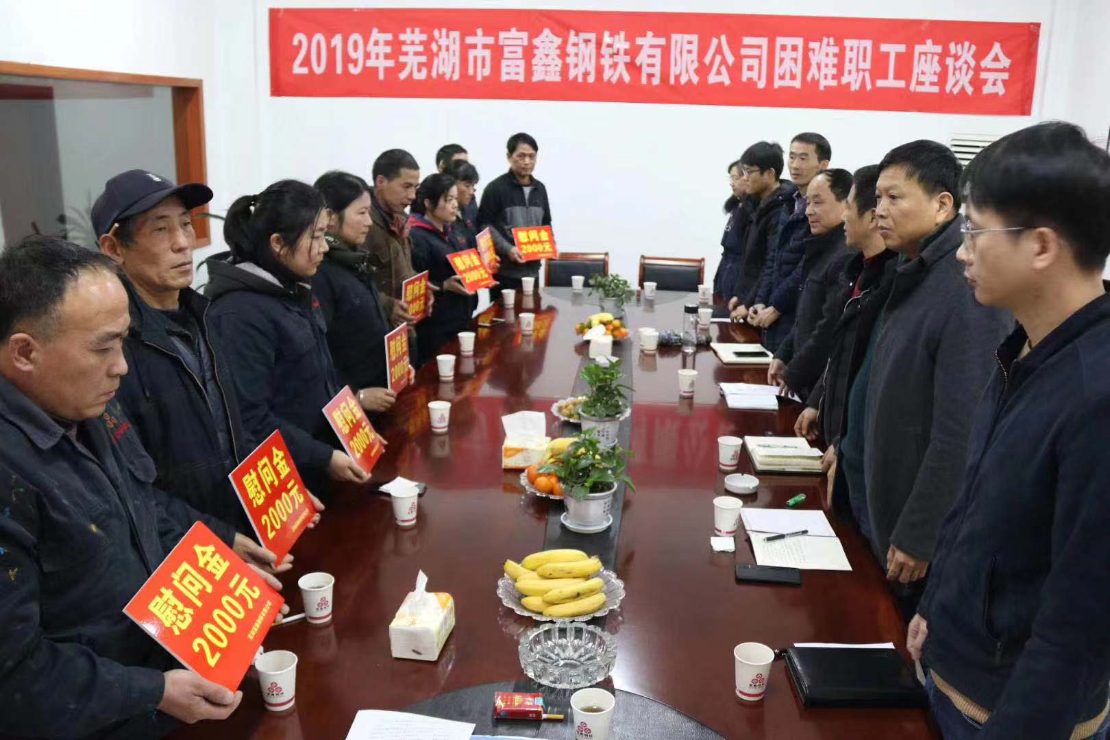 2020年春節(jié)將至,為讓困難職工度過一個溫暖祥和的春節(jié),1月7日上午,公司工會組織召開2019年度蕪湖市富鑫鋼鐵有限公司慰問困難職工座談會??h總工會黨組成員/副主席阮熙明、縣經(jīng)信局黨委委員/副局長戴元根、縣經(jīng)信局黨委委員/系統(tǒng)工會主席郝建 、縣總工會法工部副部長張陽、新港鎮(zhèn)總工會主席湯向東應邀出席會議,公司10名困難職工代表參加會議。